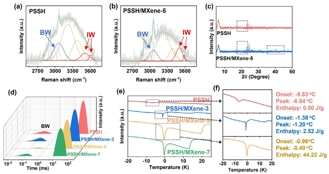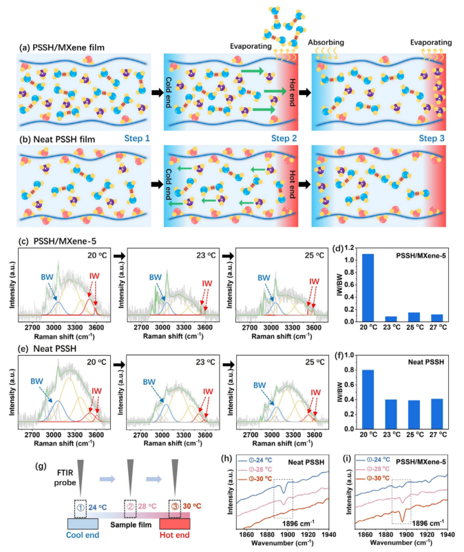 研究人员进一步通过多种手段表征了薄膜中的水状态(图3)。拉曼光谱显示,PSSH/MXene薄膜中的中间水信号显著强于纯PSSH。X射线衍射在低温下的测试表明,PSSH/MXene薄膜中冰晶衍射峰更强,意味着其结合水含量更低。低场核磁共振谱中结合水特征峰的移动和减弱,也证实水分子与PSSH链的结合变得更为松散。差示扫描量热分析表明,PSSH/MXene薄膜具有更低的蒸发焓和更高的中间水比例。