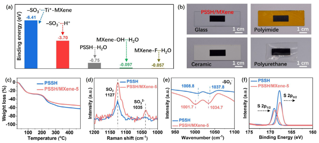 图2 PSSH/MXene复合材料的表征。 (A) 通过密度泛函理论计算的PSSH和PSSH/MXene薄膜中的结合能。(B) 印刷在不同基底上的PSSH/MXene-5薄膜的光学照片。(C) 在惰性气氛下测量的PSSH和PSSH/MXene-5薄膜的热重分析曲线。(D) PSSH和PSSH/MXene-5薄膜的拉曼光谱。(E) PSSH和PSSH/MXene-5薄膜的FT-IR光谱。(F) PSSH和PSSH/MXene-5薄膜在S 2p区域的XPS光谱。