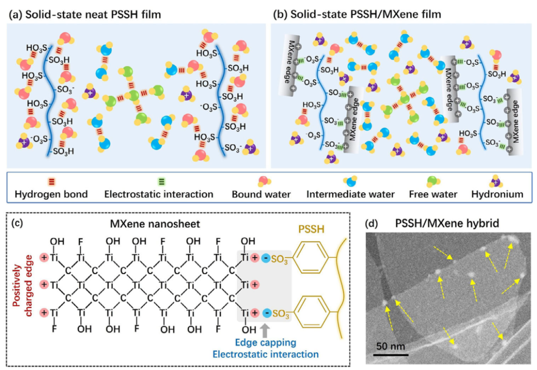 研究团队选择了具有高吸湿性和离子电导率的PSSH作为聚电解质基质。在纯PSSH薄膜中,水分子主要与磺酸基团强结合,以结合水的形式存在。为了调控水合作用,团队引入了Ti₃C₂Tₓ MXene纳米片。如图1所示,MXene纳米片表面带负电(-F, -OH),边缘的Lewis酸Ti位点带正电。透射电镜图像证实,带负电的PSSH链通过静电作用主要吸附在MXene带正电的边缘,形成了独特的边缘封端结构。