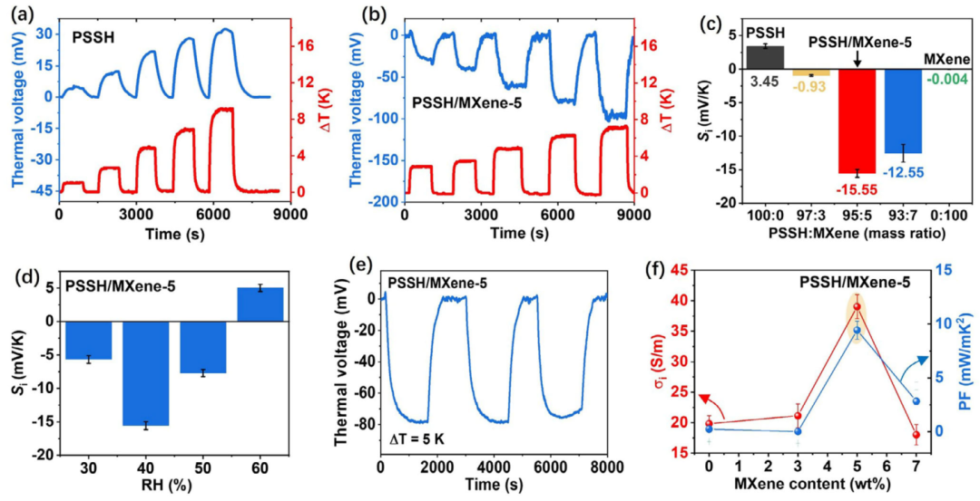 热电性能测试结果令人瞩目(图4)。纯PSSH薄膜表现出典型的P型特征,塞贝克系数约为+3.45 mV/K。而掺入MXene后,薄膜转变为N型特性。当MXene含量为5 wt.%时,性能最优,离子塞贝克系数达到-15.55 mV/K,离子电导率高达39.03 S/m,功率因子相比纯PSSH提升了数十倍。值得注意的是,该薄膜在40%相对湿度下性能最佳,并在循环温度梯度测试中表现出良好的稳定性。