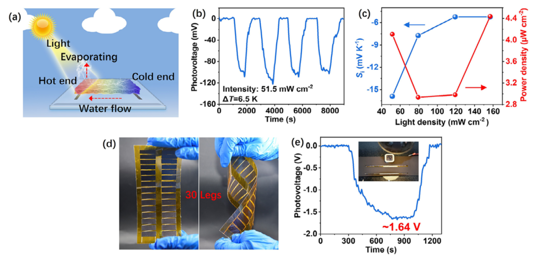 为了展示应用潜力,团队构建了原型光热电设备(图6)。利用MXene的高光热转换效率,用红外激光照射薄膜一端产生温度梯度,成功激发了N型离子热电响应,最大输出功率密度达到先进水平。更令人印象深刻的是,通过丝网印刷将30条N型PSSH/MXene薄膜串联集成在柔性聚酰亚胺基底上,在模拟太阳光照射下产生了-1.64 V的光热电压,展示了其用于柔性可穿戴能量收集的前景。