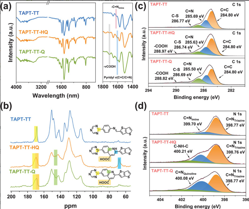 3. XPS C 1s谱图:TAPT-TT-Q (288.82 eV)和TAPT-TT-HQ (288.97 eV)显示羧酸羰基碳峰,TAPT-TT中不存在