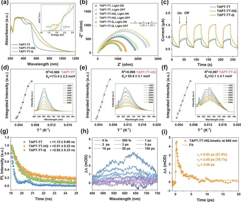 3. 光电流响应:TAPT-TT-HQ > TAPT-TT-Q > TAPT-TT,表明非共轭改性改善载流子分离