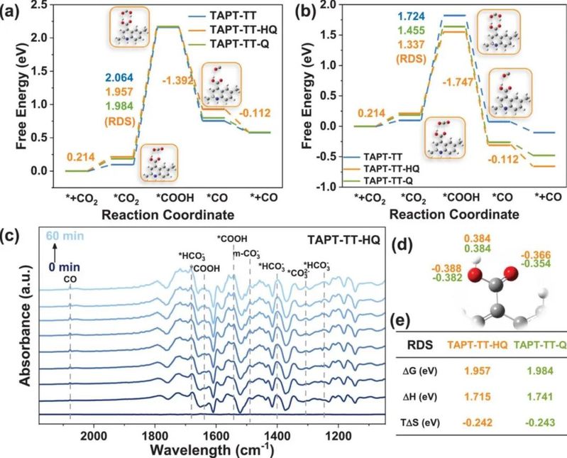2. DFT计算确定*COOH中间体形成为速率决定步骤(RDS),TAPT-TT-HQ能垒最低(1.957 eV < 1.984 eV < 2.064 eV)