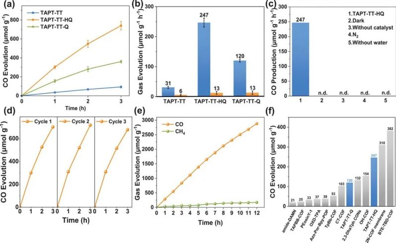 1. CO产率对比:TAPT-TT-HQ (247 ± 15 µmol g⁻¹ h⁻¹) >> TAPT-TT-Q (120 ± 5 µmol g⁻¹ h⁻¹) > TAPT-TT (31 ± 3 µmol g⁻¹ h⁻¹)