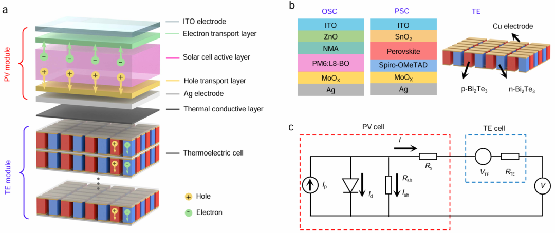 b. 有机太阳能电池(OSC)、钙钛矿太阳能电池(PSC)及热电单元的器件结构。对于 OSC,活性层为 PM6:L8-BO,ZnO/NMA 和 MnOx 分别作为电子传输层与空穴传输层。在 PSC 中,活性层为钙钛矿材料,SnO₂与 Spiro-OMeTAD/MnOx 分别作为电子传输层与空穴传输层。热电单元由多对 p/n 型碲化铋(Bi₂Te₃)热电臂串联构成,铜(Cu)层作为电极。