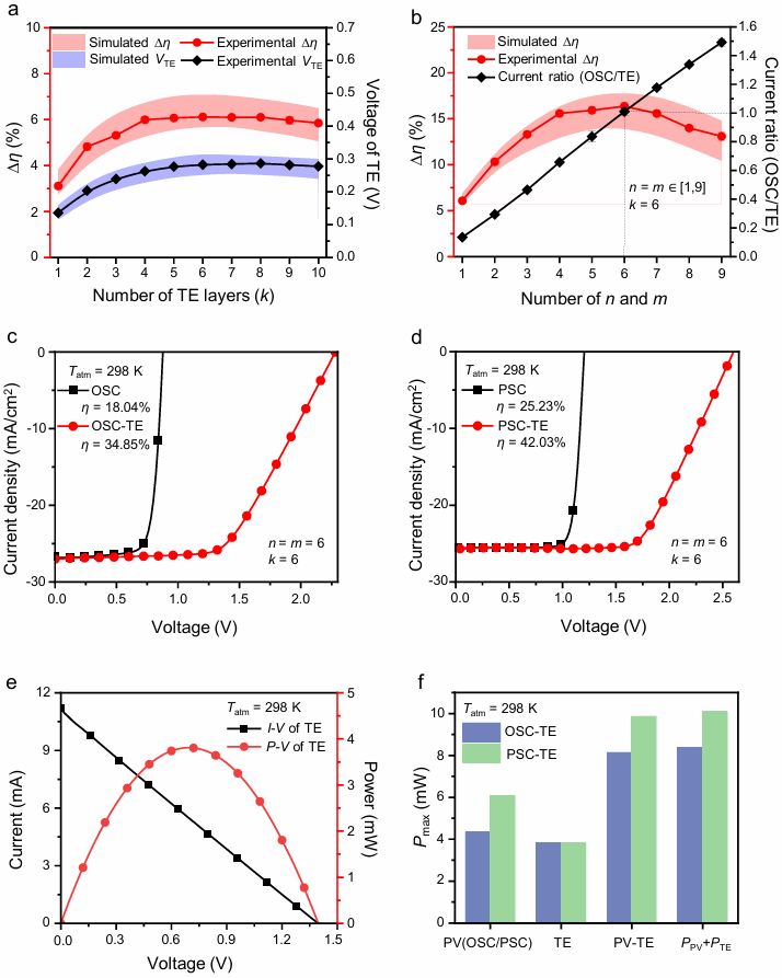 c,d. 298 K 下最优性能 OSC-TE(c)与 PSC-TE(d)集成系统的实验冠军级 JV 曲线(n = m = 6,k = 6),对应系统面积为 0.24 cm²。Tatm 为环境温度,Voc 为开路电压,Jsc 为短路电流密度,FF 为填充因子,η 为光电转换效率。