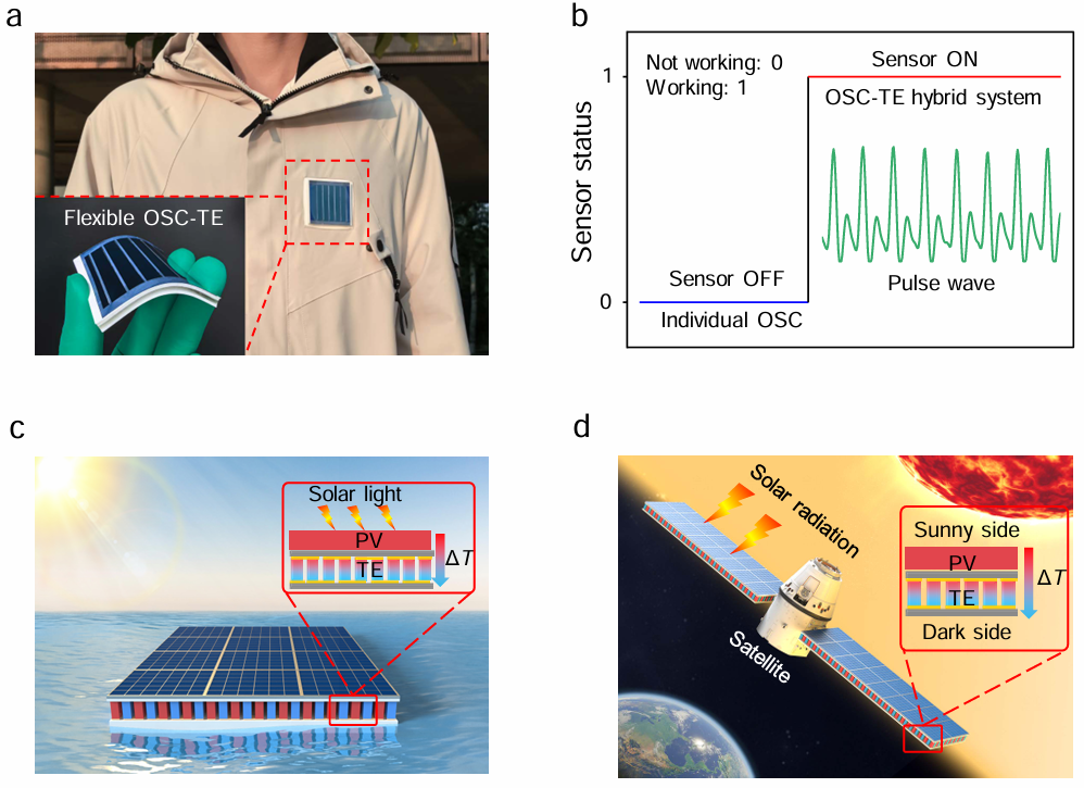 b. 在 AM 1.5G 标准太阳光照射下,OSC-TE 集成系统驱动传感器实现实时脉搏监测的演示,而单独的有机太阳能电池无法实现这一功能。