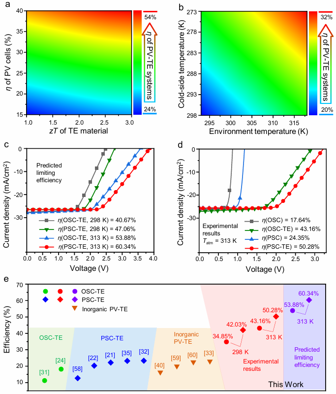 2026年4月3日,南开大学陈永胜院士/马儒军教授等于Nat. Commun.刊发溶液法制备效率超50%的光伏-热电集成系统的最新研究成果。该研究基于光伏 - 热电热电耦合模型,开展了系统的理论分析与模拟计算,结果表明:结合当前最先进的光伏技术与商业化热电技术,该系统的最高理论效率可达60.34%。依据该模型,作者将有机太阳能电池、钙钛矿太阳能电池分别与热电电池耦合,构筑了集成系统,并实现了热利用与串联光伏 - 热电组件间电流匹配的协同优化。在 AM 1.5 G 标准光照下,该集成体系在 298 K 时分别取得34.85%和42.03%的创纪录效率;在 313 K 时效率进一步提升至43.16%和50.28%。