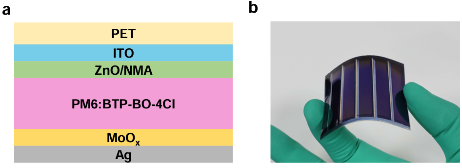 (a) 采用反式结构 PET/ITO/ZnO/NMA/PM6:BTP-BO-4Cl/MoOx/Ag 的柔性大面积有机太阳能电池(OSC)组件结构示意图。(b) 柔性大面积有机太阳能电池组件实物照片。