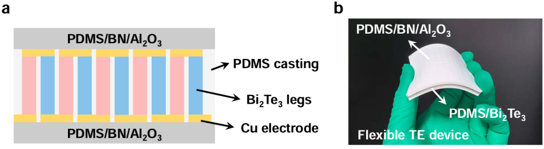 补充图23. 柔性热电器件的结构示意图(a)与实物照片(b).