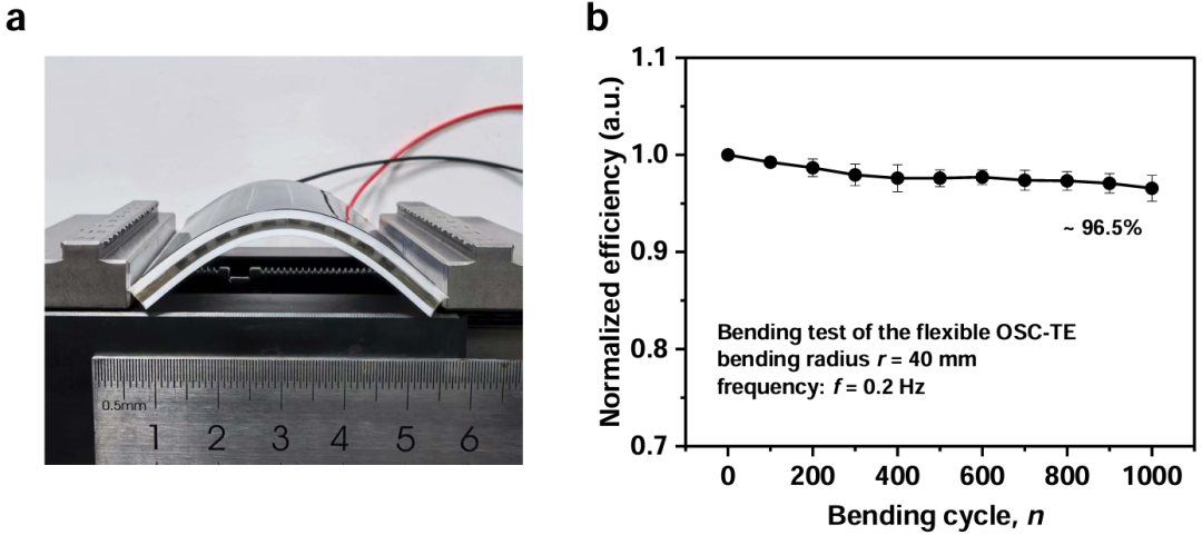 (a) 柔性 OSC-TE 集成系统弯曲测试的光学照片。(b) 该柔性 OSC-TE 集成系统在弯曲半径 r = 40 mm、频率 f = 0.2 Hz(每 5 秒一个循环)条件下的力学弯曲稳定性(1000 次循环)。弯曲应变由公式 ε = d/(2r) = 6.25% 计算得出(其中 d 为器件厚度,d = 5 mm;r 为弯曲半径)[S55]。经过 1000 次循环后,器件仍可保持约 96.5% 的初始效率。误差棒中心为平均值,误差棒为标准差,数据由至少三个独立器件的统计结果计算得到。