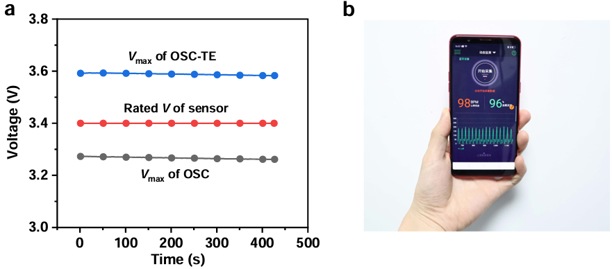 (a) 单独有机太阳能电池(OSC)与 OSC-TE 集成系统的输出电压对比,结果表明 OSC-TE 集成系统可满足脉搏传感器的供电需求。(b) 通过蓝牙将传感器与智能手机连接,实现实时健康监测界面。