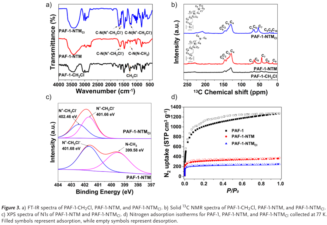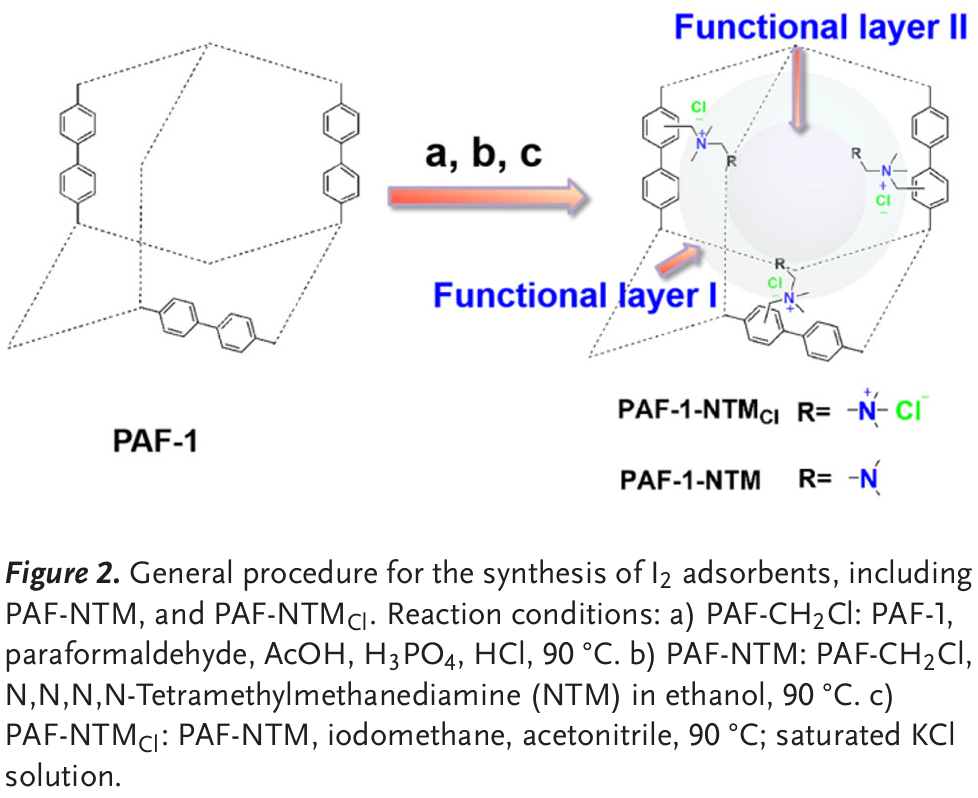 研究团队提出孔隙空间多层功能化(PSMLF)策略,通过在大孔隙的多层区域定向分布设计功能位点,最大化碘分子与功能位点的结合概率,同时保障碘分子的快速传输,从而提升高温条件下的吸附性能。为验证该策略,团队选取多孔芳香框架(PAF)作为基底材料,利用其超高比表面积、可调节结构与孔径、优异稳定性等优势,合成了两种功能化吸附剂 PAF-1-NTM 和 PAF-1-NTMCl。合成过程通过三步完成,首先 PAF-1 经氯甲基化得到 PAF-CH₂Cl,随后与 N,N,N,N-四甲基甲二胺(NTM)在乙醇中反应生成 PAF-1-NTMPAF-1-NTM 再经碘甲烷处理和饱和氯化钾溶液离子交换得到 PAF-1-NTMCl