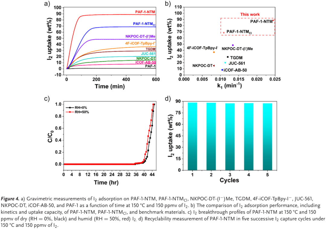 吸附性能测试在模拟工业条件(150℃150 ppmv I₂)下进行,结果显示 PAF-1-NTM 的碘吸附容量达到 88.58 wt%,是母体材料 PAF-10.82 wt%)的 108 倍,显著超越工业吸附剂 Ag@MOR 及其他已报道的高性能多孔材料(如 NKPOC-DT-(I⁻) Me 的 48.35 wt%4F-iCOF-TpBpy-I⁻的 37 wt%)。动力学方面,PAF-1-NTM 的吸附速率常数 k₁=0.025 min⁻¹,远超所有基准材料(如 NKPOC-DT-(I⁻) Me 的 0.0134 min⁻¹TGDM 的 0.012 min⁻¹)。突破实验表明,PAF-1-NTM 在干燥和相对湿度 50% 的条件下,碘吸附容量分别达到 87.5 wt% 和 86.1 wt%,去污因子介于 6711-9639(干燥)和 7692-9913(湿润)之间,去除率高达 99.977%-99.990%,满足核处理设施的监管要求。该吸附剂还具有优异的循环稳定性,经五次吸附-脱附循环后仍保持较高吸附容量,且在强酸和沸水处理 天后吸附性能几乎无衰减,制造成本相比 Ag@MOR 降低 倍。